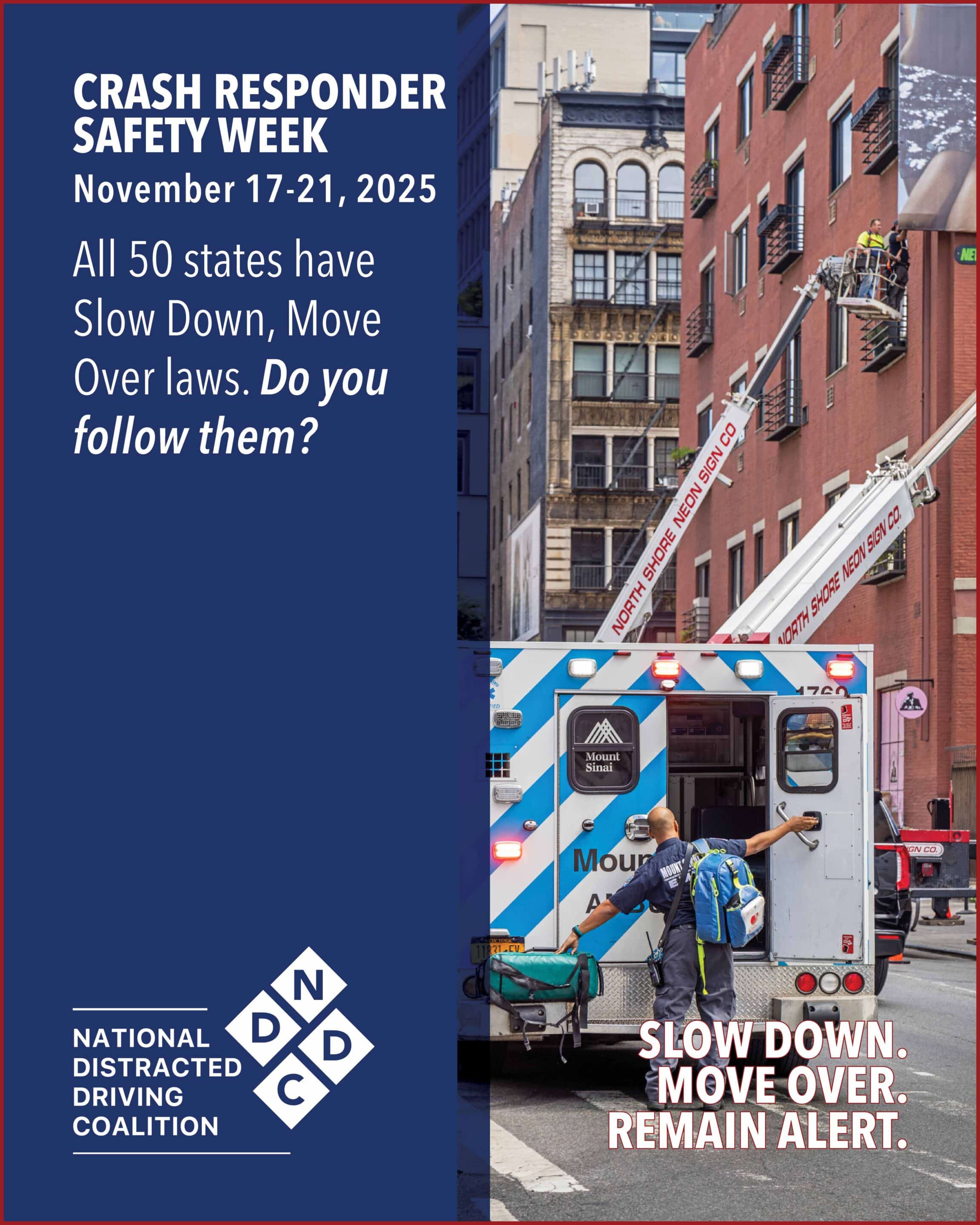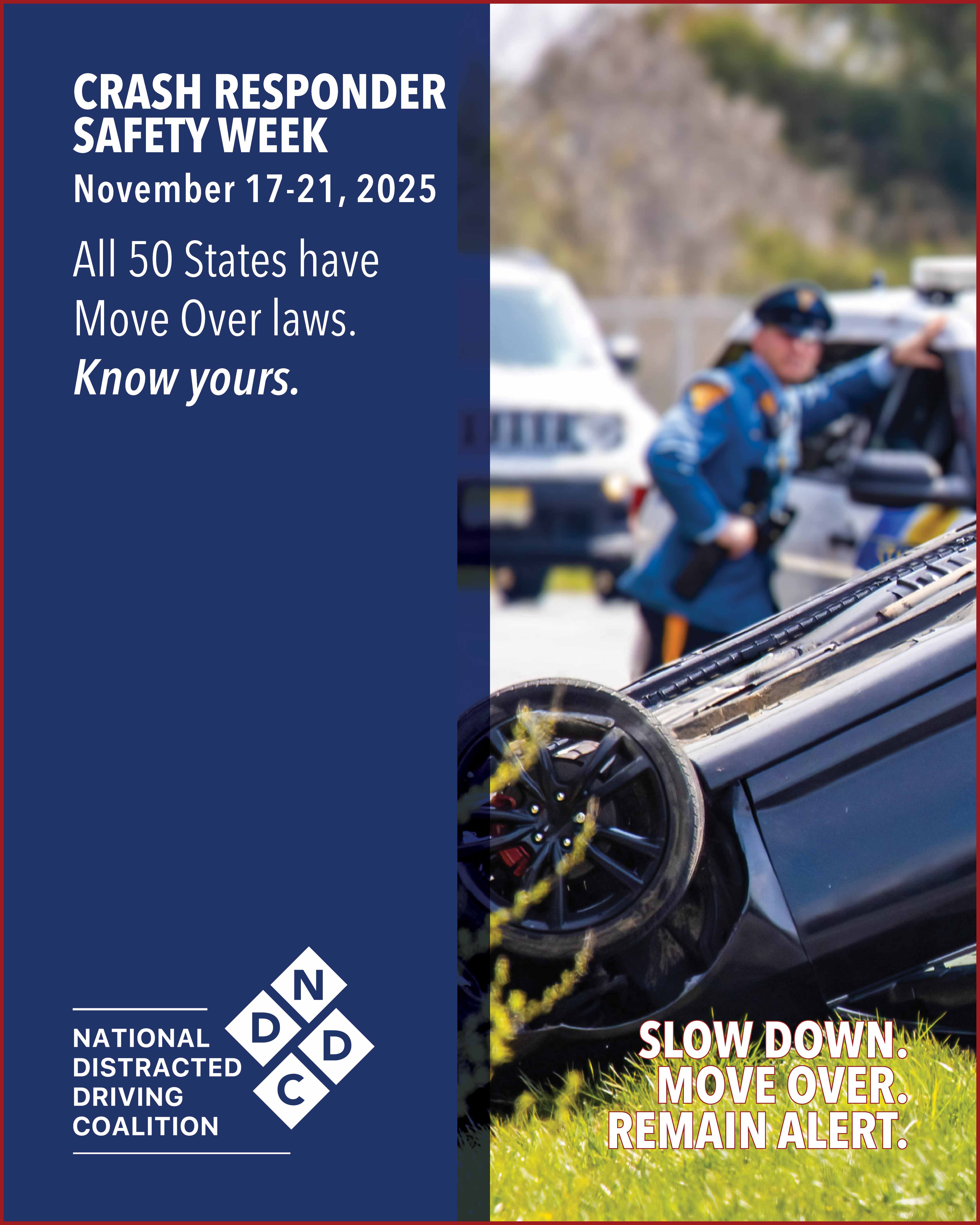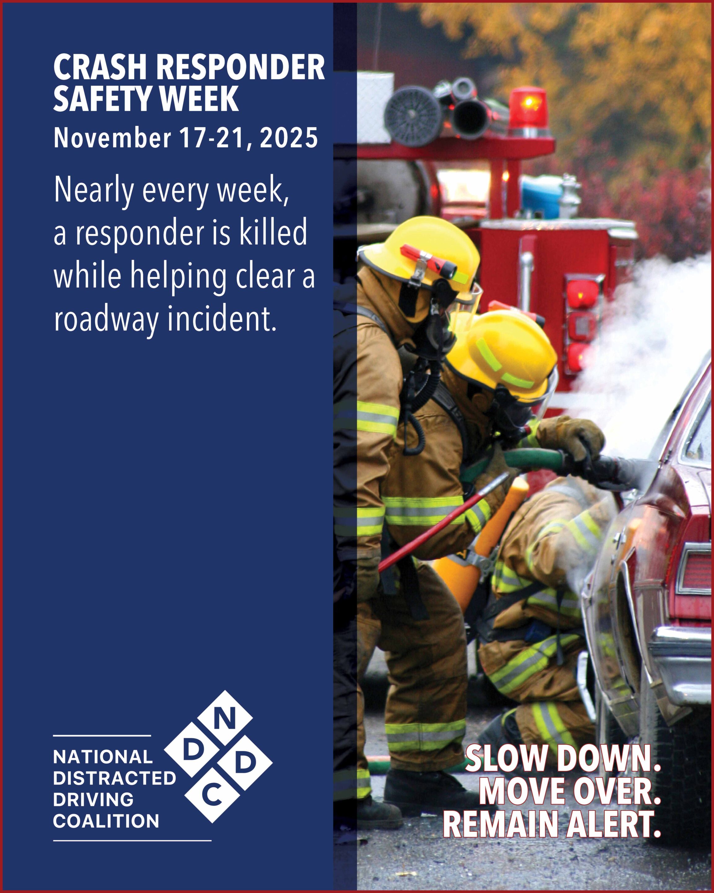 WASHINGTON, D.C. — November 17, 2025During Crash Responder Safety Week (November 17–21), the National Distracted Driving Coalition (NDDC) and the Emergency Responder Safety Institute (ERSI) are calling on all drivers to take urgent action to protect emergency responders working on our roadsides.